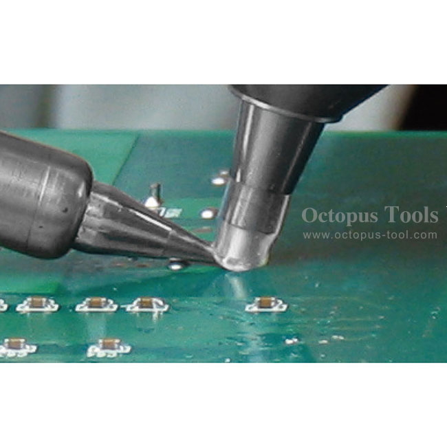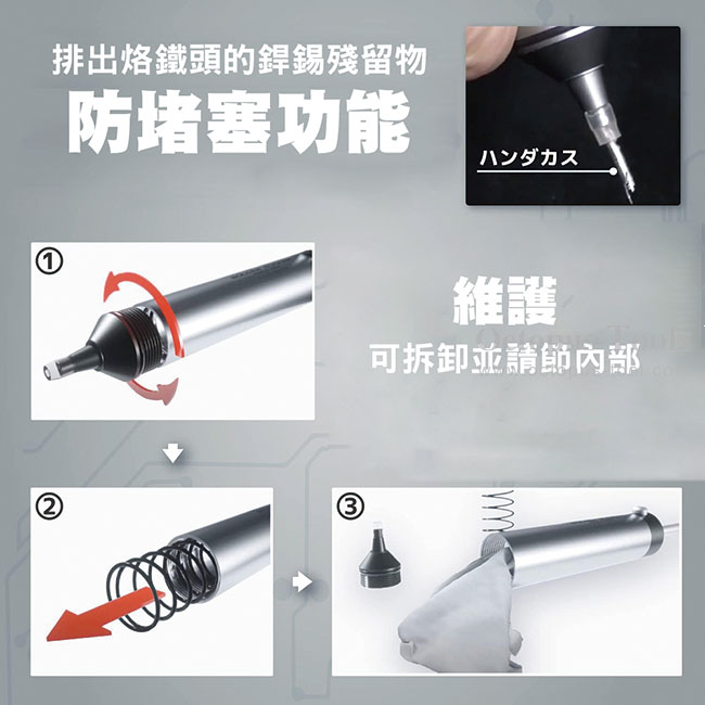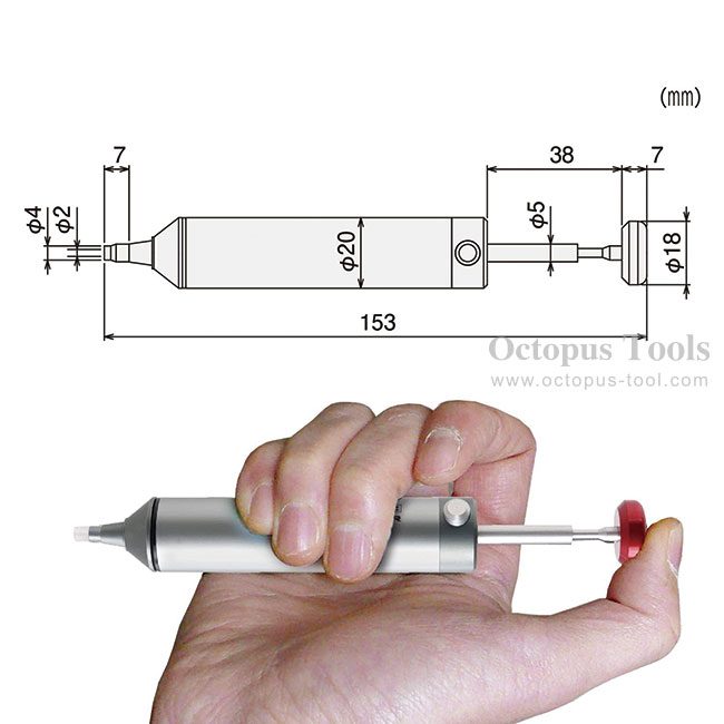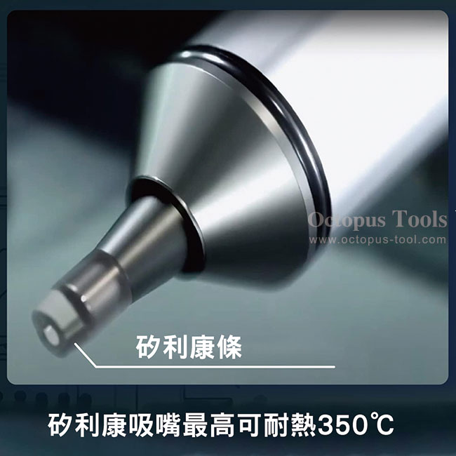 ◆ The elastic and heat-resistant silicone nozzle, which withstands contact with a soldering iron 350℃ max, is able to make the solder sucker adhere on board closely.